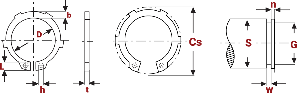 | Name | Shaft (S) | Thick (t) | Thickness Tolerance | Free Diameter (D) | Free Diameter Tolerance | Clearance on Shaft (Cs) | Beam (b) | Lug (L) | Hole Diamter (h) | Ring Load Carrying Capacity (lb.f) | Groove Diameter (G) | Groove Tolerance | Groove Width (W) | Edge Margin (n) | Groove Load Carrying Capacity (kN) | Price 1-249 | Price 250-999 | Price 1000-4999 | Price 5000-9999 | Price 10000+ | Buy |